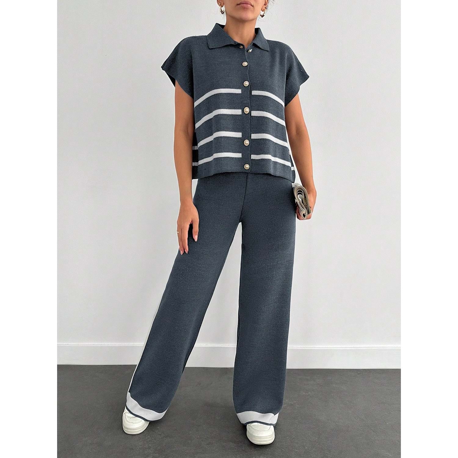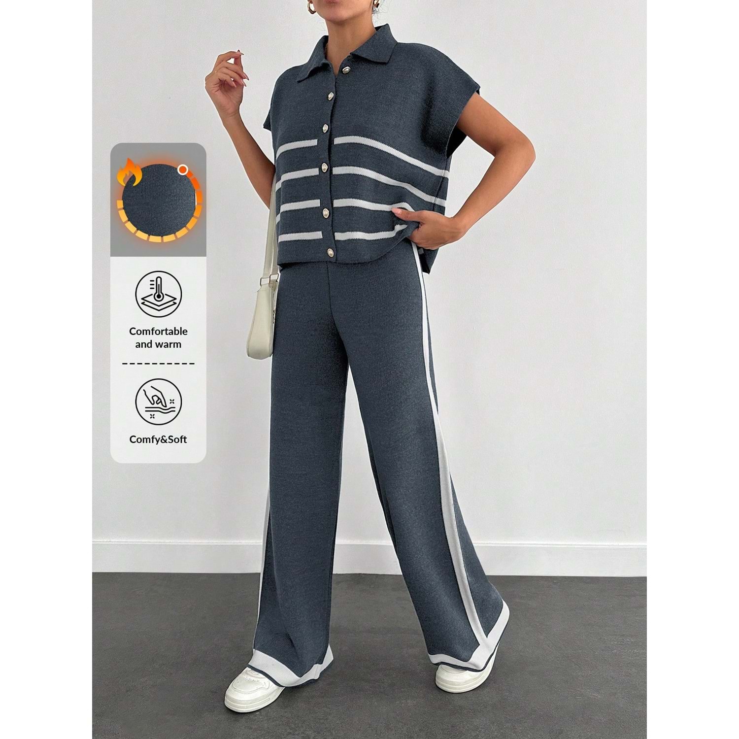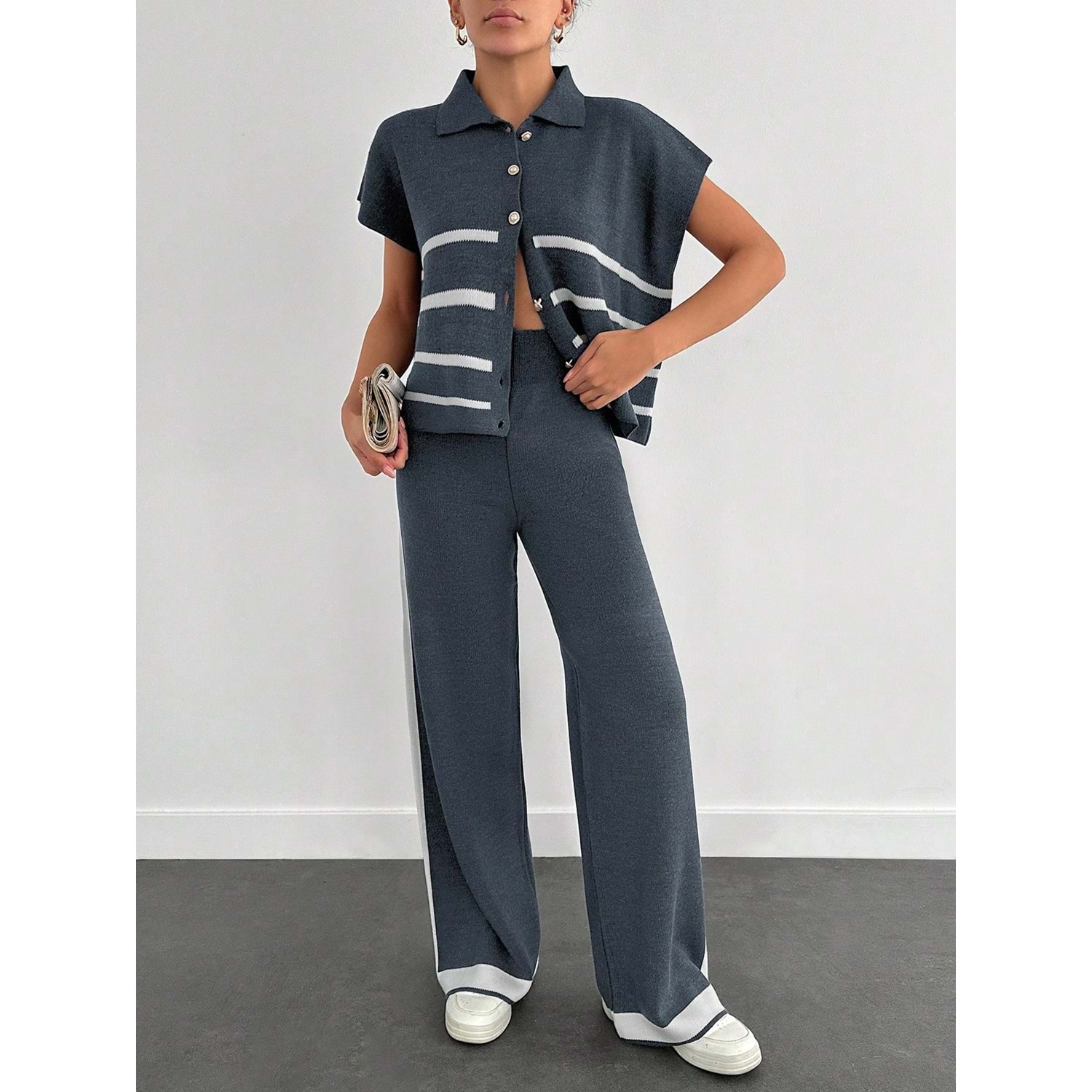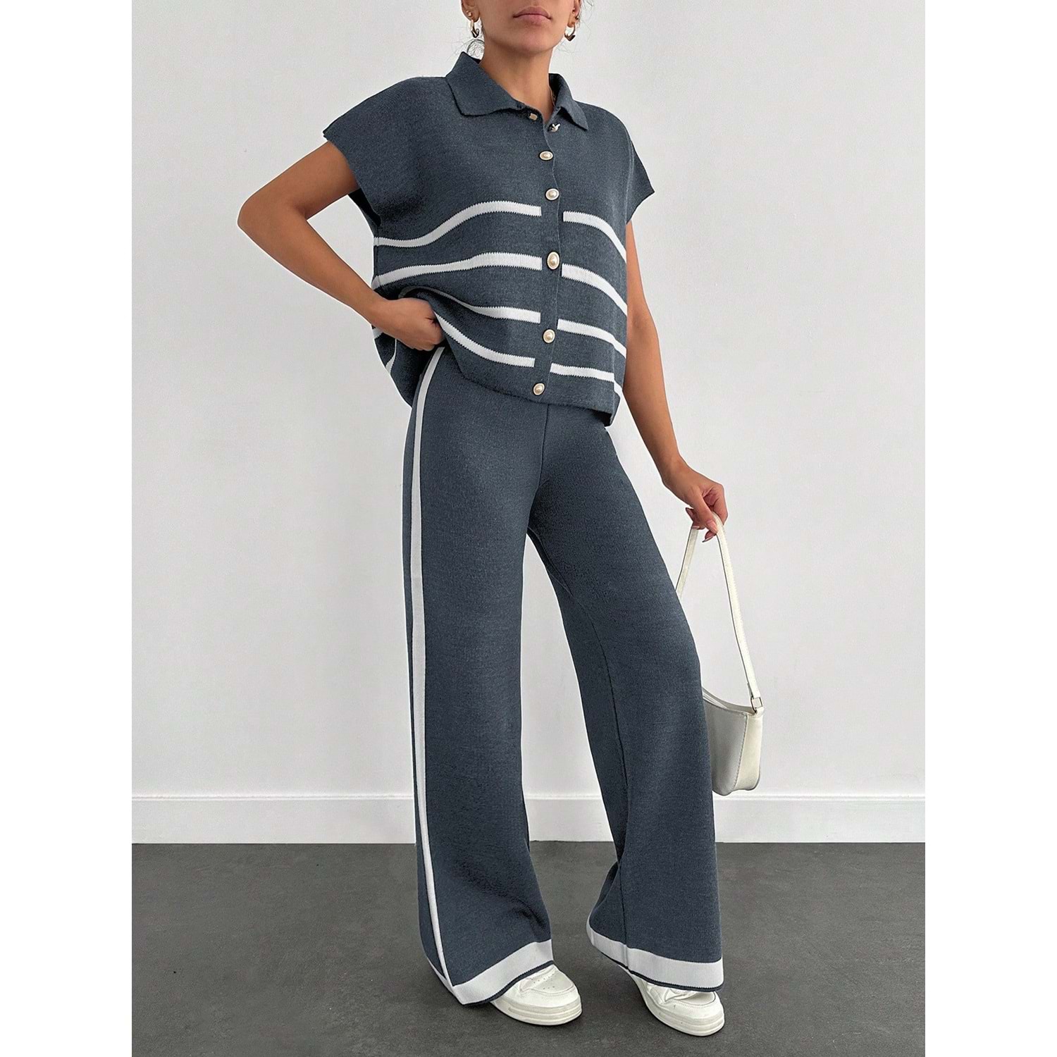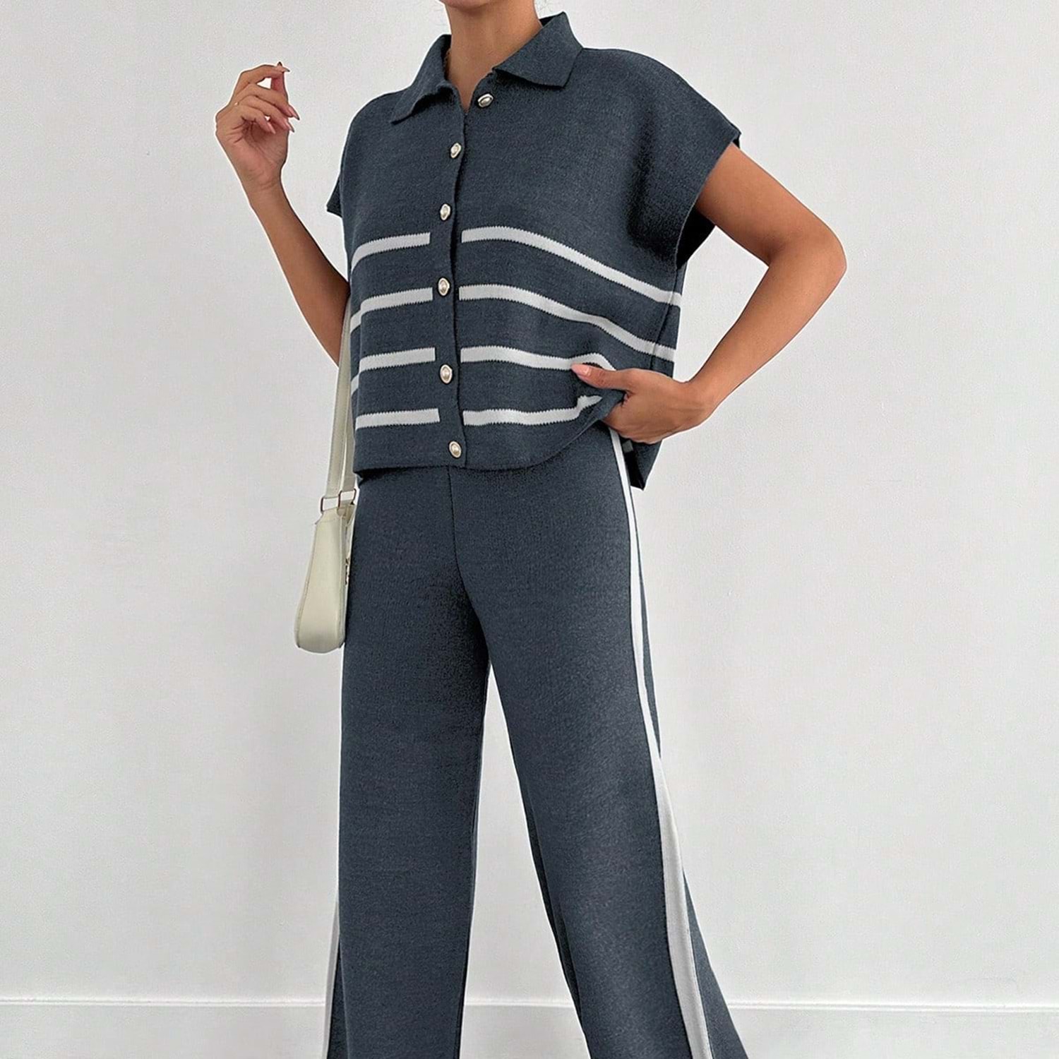 - Klasik ve şık bir görünüm için ideal, kolsuz polo yaka triko takım.